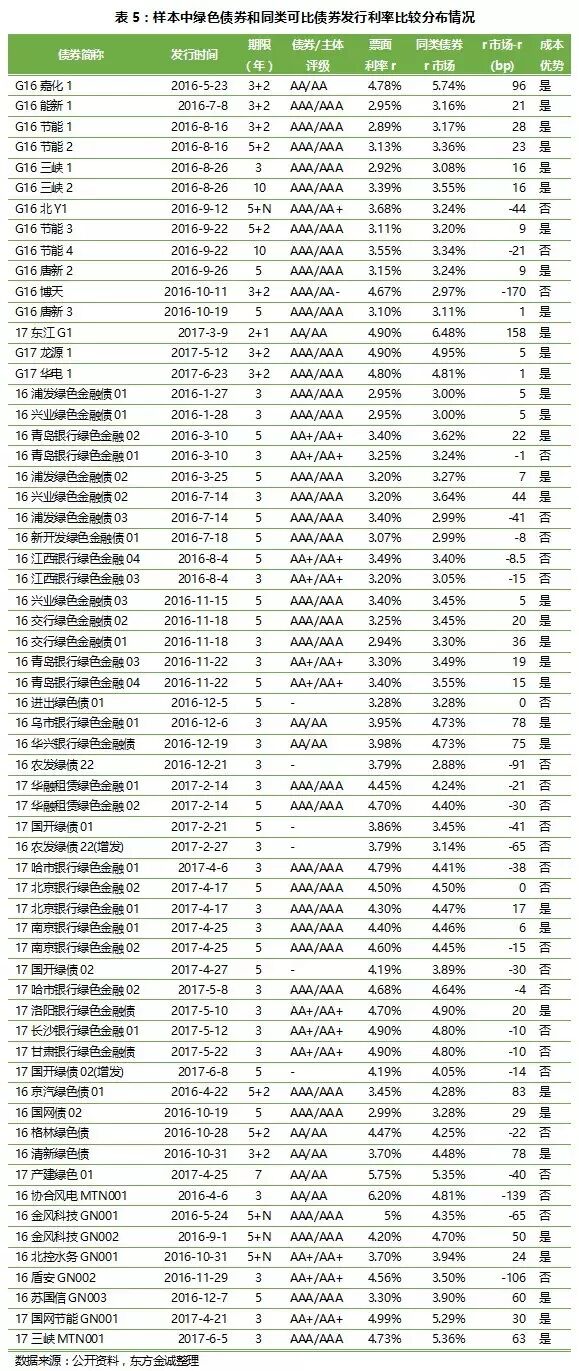 经东方金诚整理,从2016年起,截至2017年6月30日,境内发行的83只“贴标”绿色债券[8]中,共62只绿色债券有同类可比债券[9],其中35只(占比56.5%)绿色债券具有发行成本优势,其发行利率较同类可比债券平均发行利率低1-158bp,平均低21.0bp[10],绿色债券具有一定发行成本优势。其余27只绿色债券,其发行利率较同类可比债券平均发行利率高0-170bp,平均高22.0bp3。(见表5)