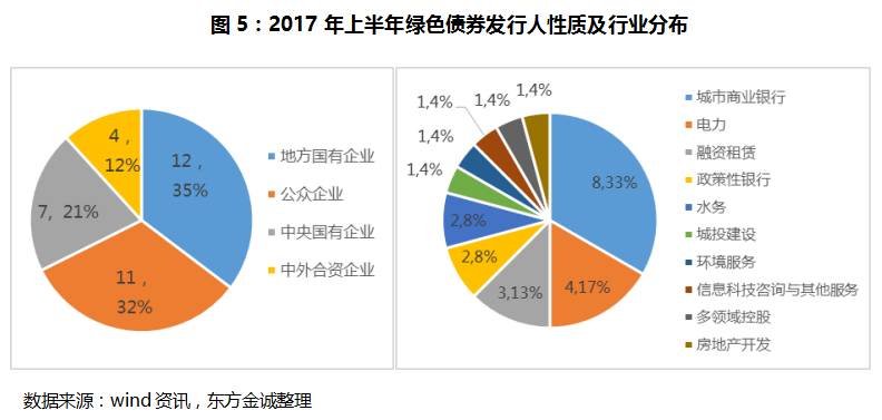 2017年上半年绿色债券发行主体覆盖地方国有企业、公众企业、中央国有企业和中外合资企业,地方国企和公众企业分别发行12只和11只绿色债券,占比合计为67%。从绿色债券发行主体行业类别来看,24个发行主体中,城商行占比33%,由去年同期的0家跃升为上半年行业占比最大的发行主体。