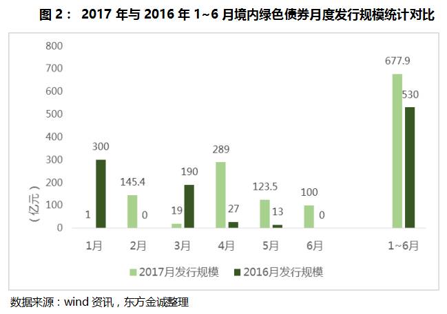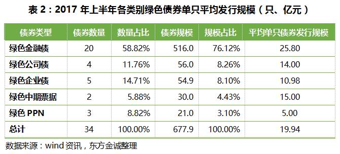2017年上半年,中国境内“贴标”绿色债券累计发行36只,其中信用债券和利率债券类型累计发行34只,规模677.9亿元;“贴标”绿色资产支持证券2只,规模47.5亿元。境内主体在境外发行1只绿色债券,发行规模6.5亿欧元(约合人民币51.3亿元),总计776.7亿元,约占同期全球绿色债券发行规模的23%。境内上半年绿色债券发行数量和规模[1](34只,677.9亿元)较去年同期(9只,530亿元)分别增长278%和28%,单只绿色债券平均发行规模远低于去年同期。2017年上半年我国境内新发行债券规模为18.06万亿元,绿色债券发行规模占新发行债券总发行规模的0.40%,高于去年同期的0.29%。