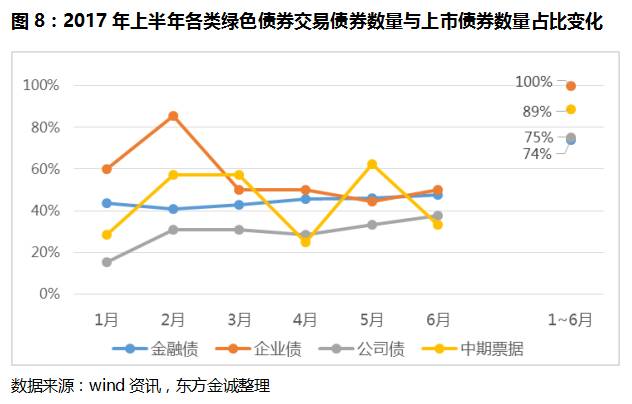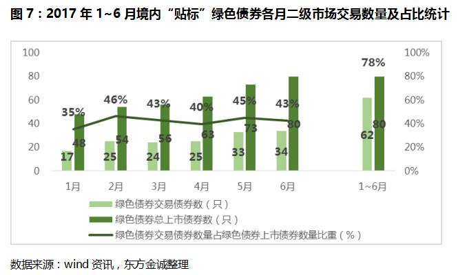 2017年1~6月境内 80只“贴标”绿色债券[5]中,共62只绿色债券发生二级市场现券交易,其中31只为绿色金融债,发生交易的绿色债券占总上市债券比重达78%(见图7)。