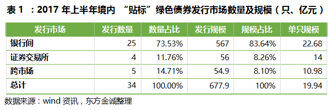 1. 一级市场发行同比大幅增长:2017年上半年境内绿色债券市场发展势头良好,绿色债券累计发行34只,发行规模677.9亿元,发行数量、规模较去年同期分别增长278%和28%,银行间市场、绿色金融债是绿色债券的主要发行场所和主要类型,79%的绿色债券采用了第三方绿色认证。