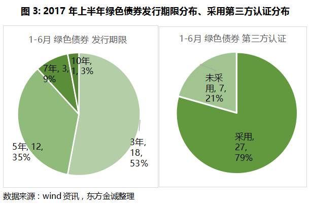 2017年上半年,随着中国境内绿色债券市场规模不断壮大,发行主体更加丰富,产品创新不断出现,首单绿色资产支持票据、首单绿色熊猫债、首单非公开可续期公司债等新品种均于上半年成功发行。银行间市场、绿色金融债是绿色债券的主要发行场所和主要类型,发行期限以3年期和5年期为主,79%的绿色债券采用第三方绿色认证。东方金诚依据债券发行要素进行统计分析。
