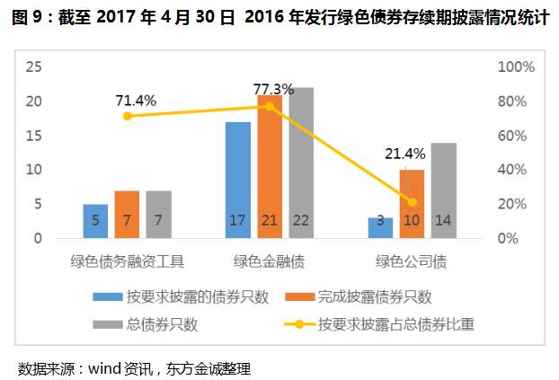 据东方金诚从wind资讯上收集的信息统计,截至2017年6月30日,已发行的68只绿色债券中,除去2只非公开发行的绿色债券[6]和18只2017年发行的债券,剩余48只绿色债券中,完成绿色债券存续期披露的绿色债券共43只,其中符合监管所有披露要求的共30只[7],占总债券数量的62.5%。