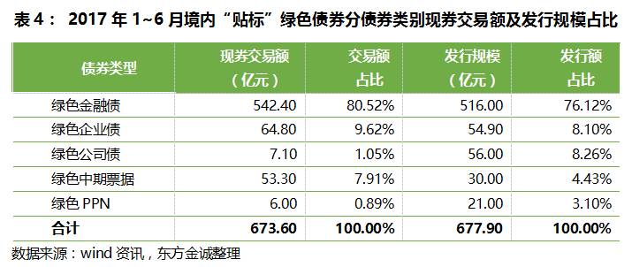 2017年上半年,中国境内“贴标”绿色债券在二级市场现券交易额累计达673.7亿元。从现券交易额走势来看,月交易额呈逐月上升趋势。绿色金融债是绿色债券二级市场交易的主要类型,其现券交易额占比达80.52%(表4)。而发行规模排名第二的绿色公司债,交易活跃度很低,全年现券交易额仅占总体的1.05%