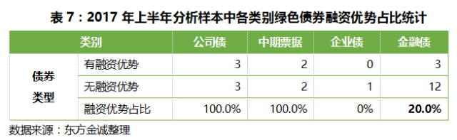 分时间来看,分析样本中,2016年具有融资优势的绿色债券占比为65.9%(27/41),2017年上半年该指标为38.1%(8/21),下降27.8pp,降幅较大。