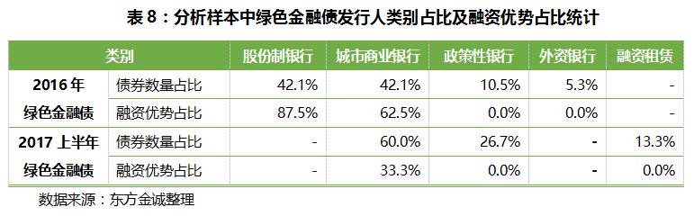 下降原因分析,一方面,发行人类型上,2017年上半年绿色金融债券发行主体主要为地方城市商业银行(数量占比60.0%,但有融资优势占比仅33.3%),虽然整体信用等级较高,但相比全国性的股份制银行(2016年数量占比42.1%,有融资优势占比87.5%),其在绿色信贷的管理、组织机构设置和环境风险识别方面,实践和管理能力还有待进一步被验证,这或是影响相对普通债券绿色债券识别度的一个重要因素;另一方面,我们观察到政策性银行发行的绿色债券相比同期可比的其他政策性银行债券,发行成本优势不显著,这可能是由于绿色因素为本身风险较低的政策性银行债券带来的边际风险下降较小,也反映了将环境因素纳入债券定价的机制和方法还有待进一步开发和完善。