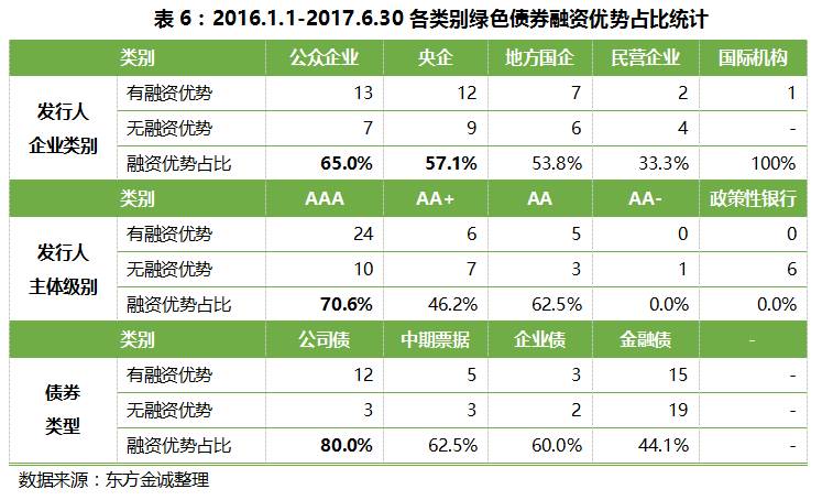 5. 发行成本优势明显:截至2017年6月30日境内发行的所有“贴标”绿色债券中,56.5%具有发行成本优势,发行利率较同类可比债券平均发行利率低1-158bp(平均低21.0bp),其中高信用级别的发行主体的绿色融资成本优势更明显。