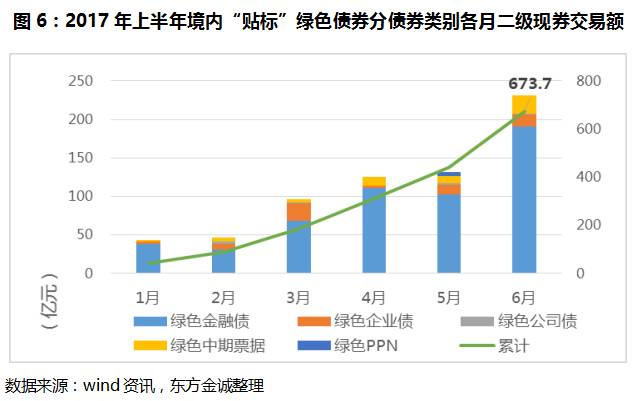 2. 二级市场活跃度有所提升:2017年上半年境内“贴标”绿色债券在二级市场现券交易额累计达673.7亿元,月现券交易额逐月上升,绿色金融债是主要交易品种。各类绿色债券交易活跃度较高,发生交易数量与相应类别上市绿色债券数量之比均超7成。