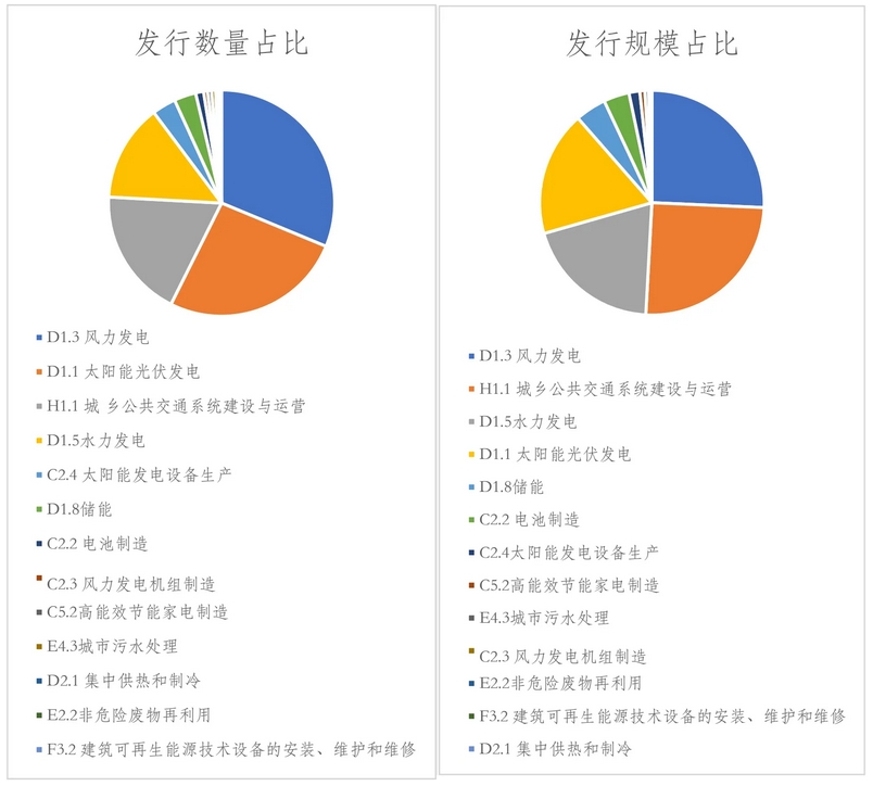 分经济活动看,发行只数占比前三的子行业为:D1.3风力发电(31.25%)、D1.1太阳能光伏发电(26.14%)、H1.1城乡公共交通系统建设与运营(18.47%);发行规模占比前三的子行业为:D1.3风力发电(25.69%)、H1.1城乡公共交通系统建设与运营(25.17%)、D1.5水力发电(19.71%)。