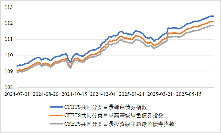 2025年6月30日,CFETS共同分类目录绿色债券指数、CFETS共同分类目录高等级绿色债券指数、CFETS共同分类目录投资级主题绿色债券指数分别收于112.4424、112.1035、111.8605,较上季度末上浮0.99%、0.97%、0.94%。